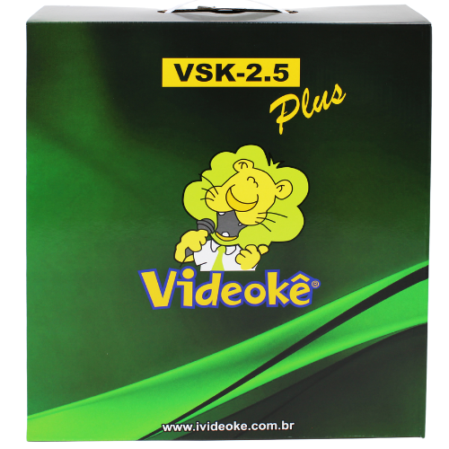Aparelho de videokê VSK 2.5 c/12.639 músicas, já inseridas. Sendo 7.936 nacionais(memória, INF, pacotes 1 ao 40), 2.736 internacionais (pacotes USA, INT01 ao INT14), 1.550 japonesas (pacotes JP1 ao JP8C) e 417 evangélicas (EVAN, EVAN04, EVAN 101).