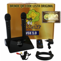 Aparelho de videokê VSK 5.0 c/11.999 músicas, já inseridas. Sendo 7.456 nacionais(memória, INF, pacotes 1 ao 37), 2.576 internacionais (pacotes USA, INT01 ao INT13), 1.550 japonesas (pacotes JP1 ao JP8C) e 417 evangélicas (EVAN, EVAN04, EVAN 101) + CARTÃO DE 800 CRÉDITOS.