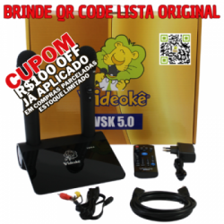 Aparelho de videokê VSK 5.0 c/11.999 músicas, já inseridas. Sendo 7.456 nacionais(memória, INF, pacotes 1 ao 37), 2.576 internacionais (pacotes USA, INT01 ao INT13), 1.550 japonesas (pacotes JP1 ao JP8C) e 417 evangélicas (EVAN, EVAN04, EVAN 101).